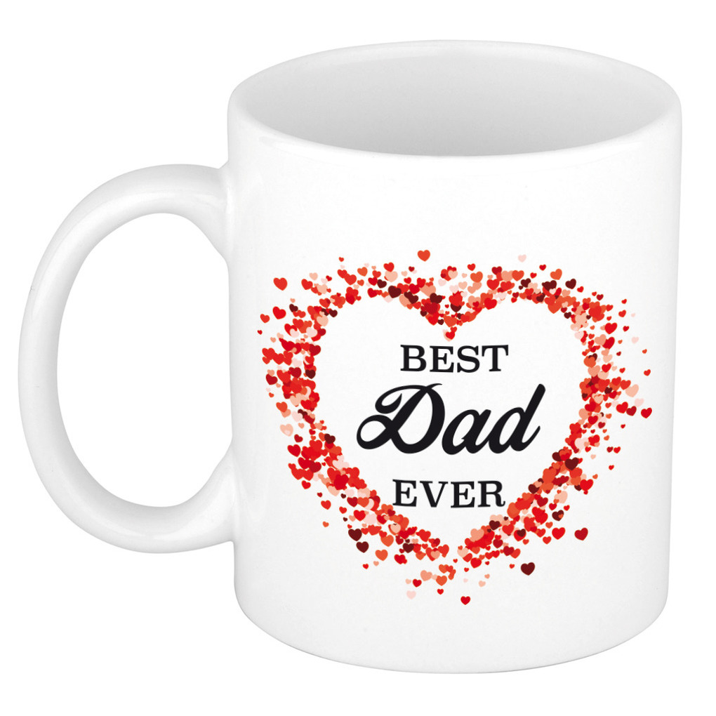 Best dad ever cadeau mok / beker wit, 300 ml. Deze mok/ beker is bedrukt met de tekst: Best dad ever. Met allemaal kleine hartjes in de vorm van een hart. Een leuke mok voor papa! Bijvoorbeeld als cadeau voor Vaderdag of voor zijn verjaardag. Verras papa omdat hij het verdient! De beker is magnetronbestendig en vaatwasmachinebestendig en heeft een inhoud van c.a. 300 ml. Materiaal: keramiek hoogte: 9,5 cm doorsnede: 8,2 cm