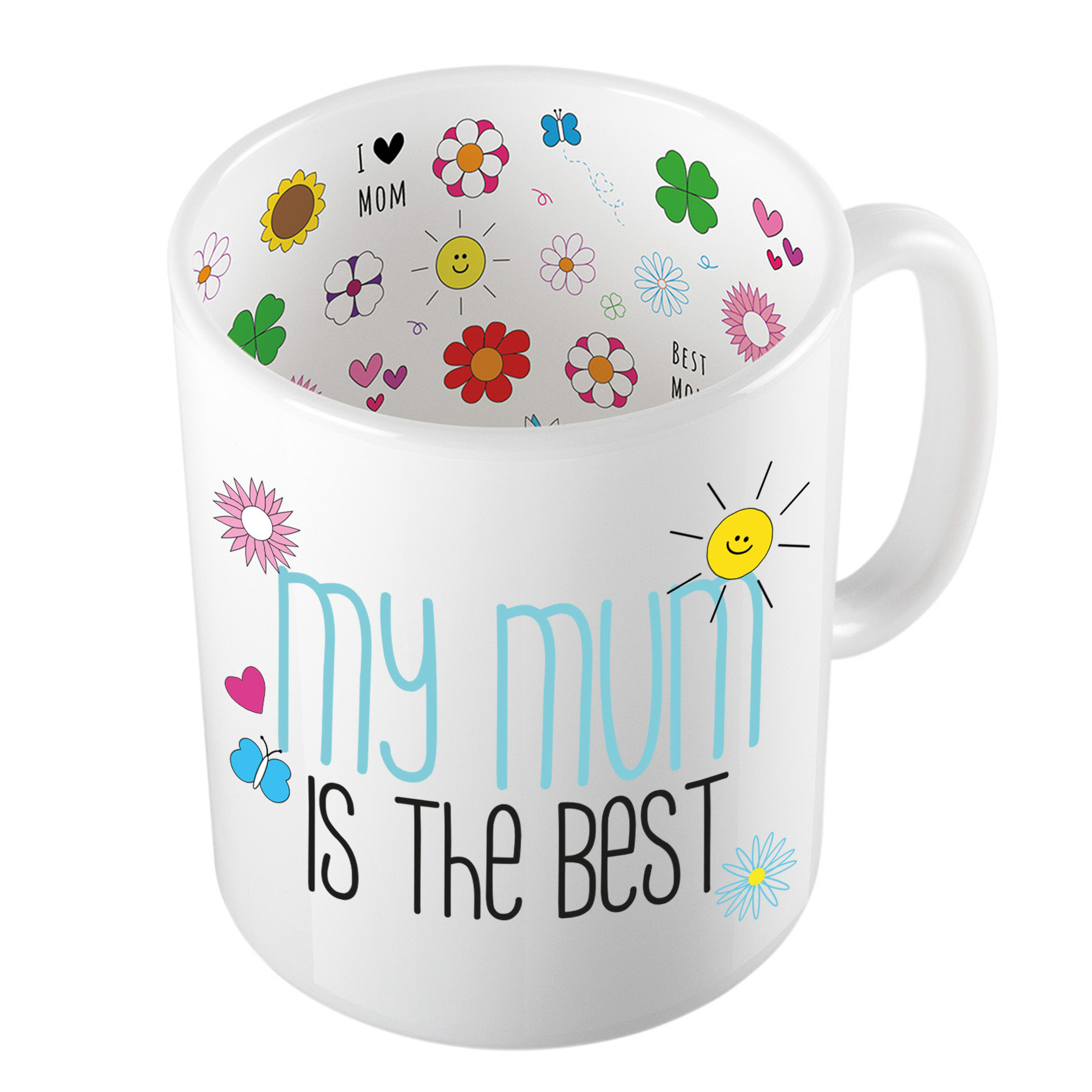 Cadeau koffie/thee mok voor mama in de kleur blauw met een vrolijk versierde binnenkant wat de mok een lief en speels uiterlijk geeft. Deze leuke vrolijke mok is bedrukt met de tekst: My mum is the best. Is jouw moeder binnenkort jarig, geef dan deze leuke koffie/thee mok cadeau, bijvoorbeeld gevuld met chocolaatjes of iets anders lekkers. Het ideale cadeau voor de verjaardag van je moeder, Moederdag of gewoon zomaar. De mok is gemaakt van keramiek en daardoor magnetron- en Vaatwasserbestendig. De afmetingen van de beker zijn ca. 8 x 9,5 cm en de inhoud is ongeveer 300 ml.