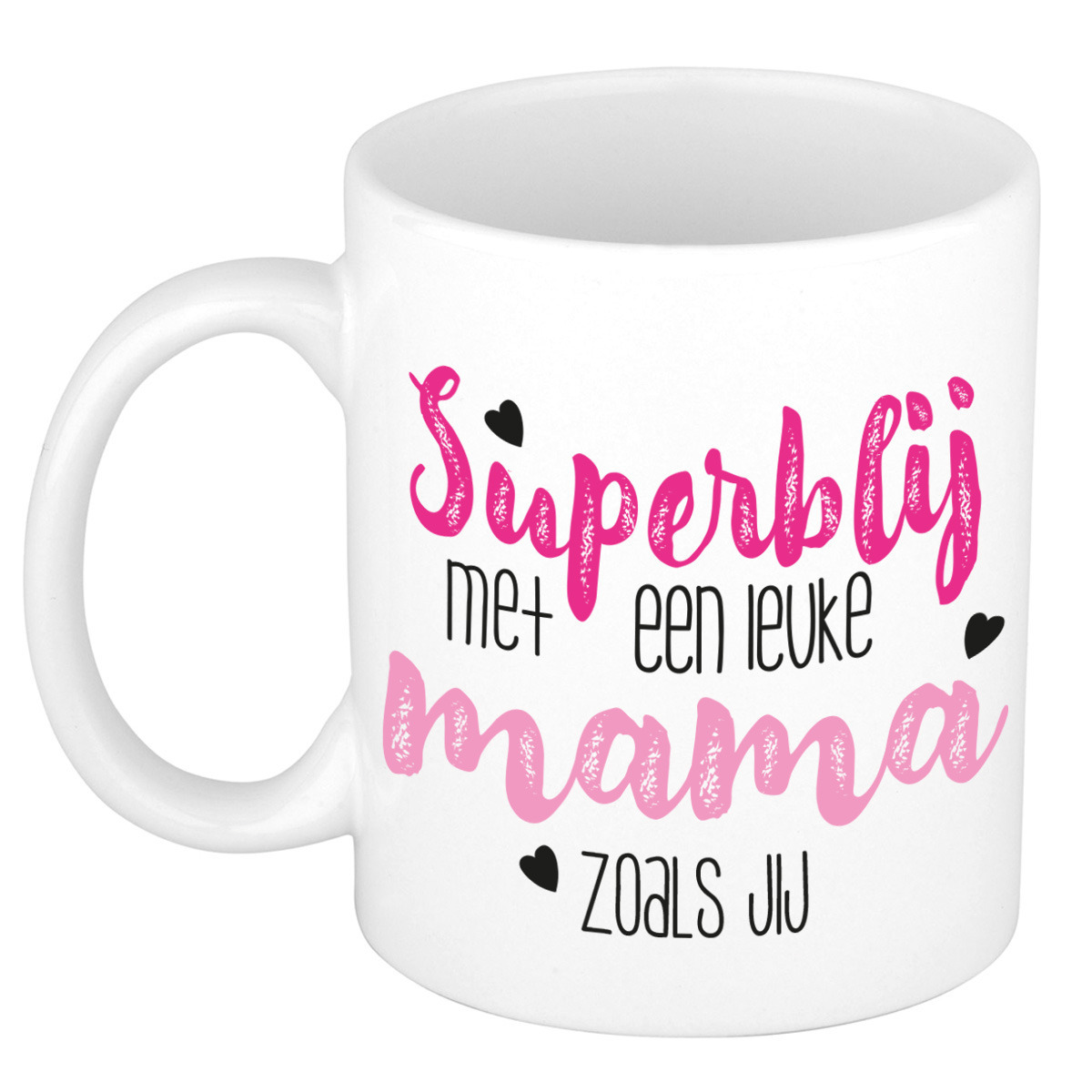 Cadeau koffie/thee mok voor mama in de kleur roze. Deze leuke mok is bedrukt met de tekst: *Superblij met een leuke MAMA zoals JIJ*. Is jouw moeder binnenkort jarig, geef dan deze leuke koffie/thee mok cadeau, bijvoorbeeld gevuld met chocolaatjes of iets anders lekkers. Het ideale cadeau voor de verjaardag van je moeder, Moederdag of gewoon zomaar. De mok is gemaakt van keramiek en daardoor magnetron- en vaatwasserbestendig. De afmetingen van de beker zijn ca. 8 x 9,5 cm en de inhoud is ongeveer 300 ml.