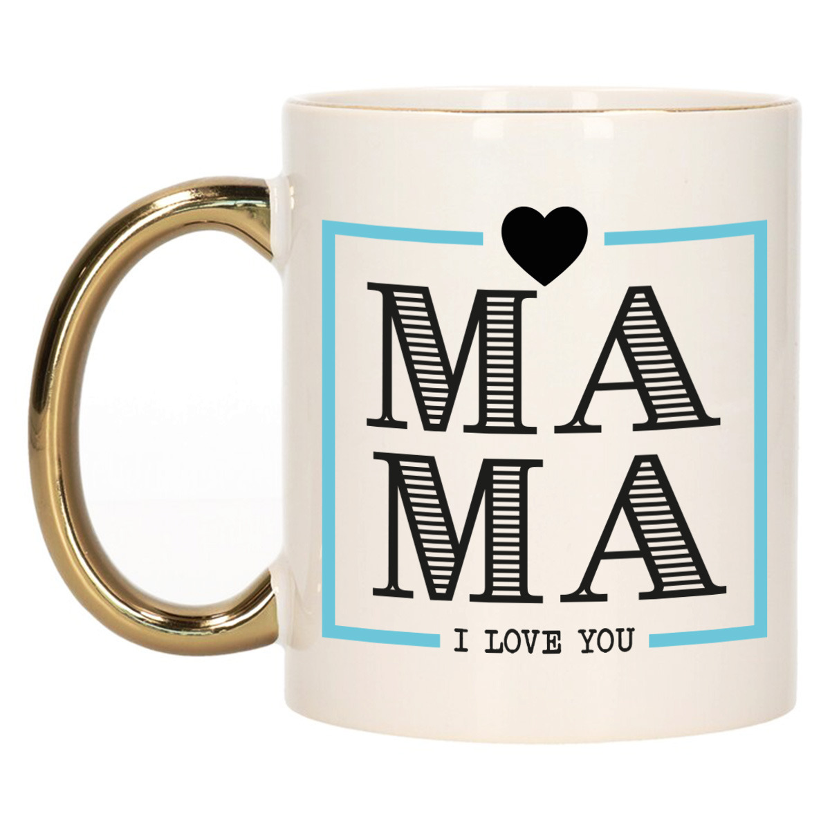 Cadeau koffie/thee mok voor mama in de kleur wit met een blauw randje en een gouden handvat. Deze leuke mok is bedrukt met de tekst: *MAMA I Love You* met een lief hartje. Is jouw moeder binnenkort jarig, geef dan deze leuke koffie/thee mok cadeau, bijvoorbeeld gevuld met chocolaatjes of iets anders lekkers. Het ideale cadeau voor de verjaardag van je moeder, Moederdag of gewoon zomaar. De mok is gemaakt van gouden oor en daardoor magnetron- en Vaatwasserbestendig. De afmetingen van de beker zijn ca. 8 x 9,5 cm en de inhoud is ongeveer 300 ml.