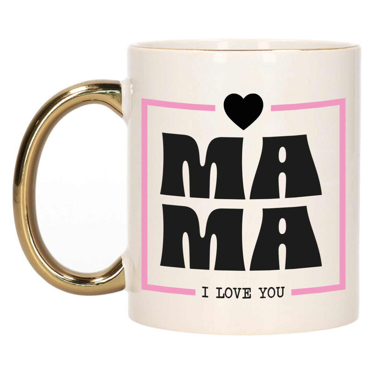 Cadeau koffie/thee mok voor mama in de kleur wit met een roze randje en een gouden handvat. Deze leuke mok is bedrukt met de tekst: *MAMA I Love You* met een lief hartje. Is jouw moeder binnenkort jarig, geef dan deze leuke koffie/thee mok cadeau, bijvoorbeeld gevuld met chocolaatjes of iets anders lekkers. Het ideale cadeau voor de verjaardag van je moeder, Moederdag of gewoon zomaar. De mok is gemaakt van keramiek en daardoor magnetron- en Vaatwasserbestendig. De afmetingen van de beker zijn ca. 8 x 9,5 cm en de inhoud is ongeveer 300 ml.