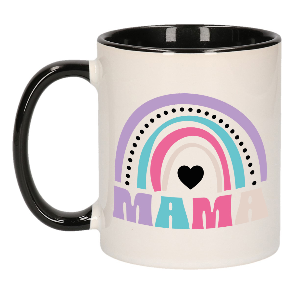 Cadeau koffie/thee mok voor mama in de kleur zwart. Deze leuke mok is bedrukt met de tekst: *MAMA* met regenboog kleuren en met een lief hartje. Is jouw moeder binnenkort jarig, geef dan deze leuke koffie/thee mok cadeau, bijvoorbeeld gevuld met chocolaatjes of iets anders lekkers. Het ideale cadeau voor de verjaardag van je moeder, Moederdag of gewoon zomaar. De mok is gemaakt van keramiek en daardoor magnetron- en Vaatwasserbestendig. De afmetingen van de beker zijn ca. 8 x 9,5 cm en de inhoud is ongeveer 300 ml.