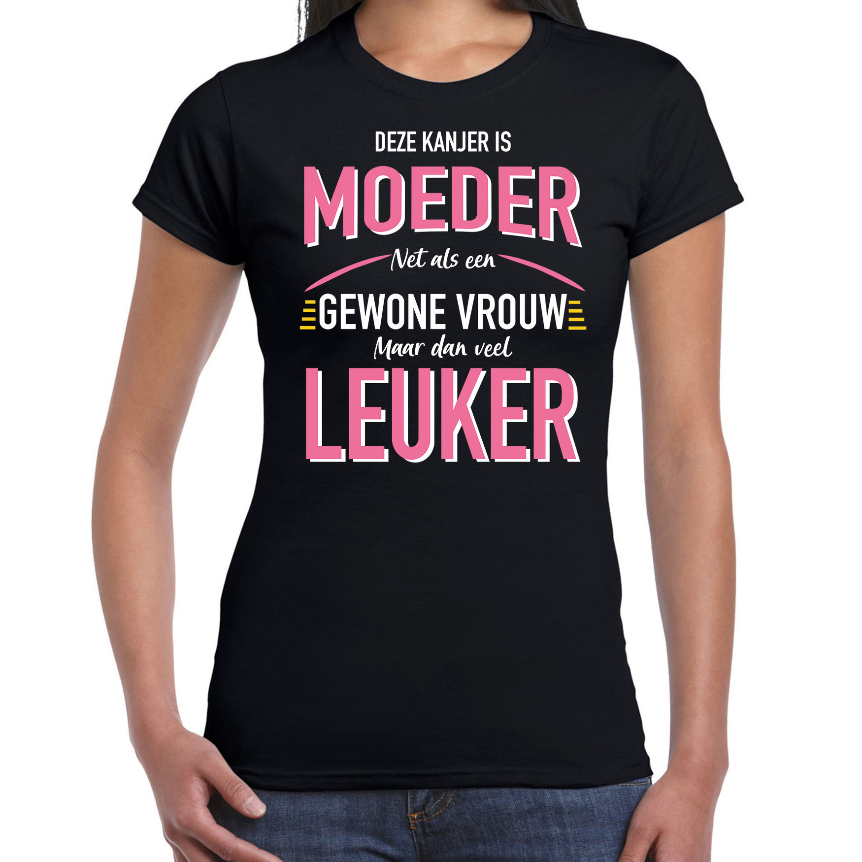 Deze kanjer is moeder maar dan veel leuker cadeau t-shirt zwart voor dames. Op dit zwarte shirt staat: Deze kanjer is moeder net als een gewone vrouw maar dan veel leuker. Het t-shirt is leuk om bijvoorbeeld kado te doen tijdens Moederdag, de verjaardag van een moeder of gewoon zomaar om een moeder te verrassen.