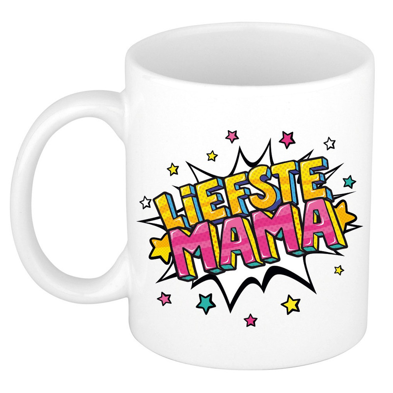 Liefste mama cadeau mok / beker wit met sterren in pop art. Deze koffiemok / theebeker is wit en bedrukt met de tekst: Liefste mama. Deze mok heeft een inhoud van c.a. 300 ml. De beker is magnetron en vaatwasmachine bestendig. Materiaal: keramiek. Hoogte: 9,5 cm. Doorsnede: 8,2 cm. Kleur: wit.