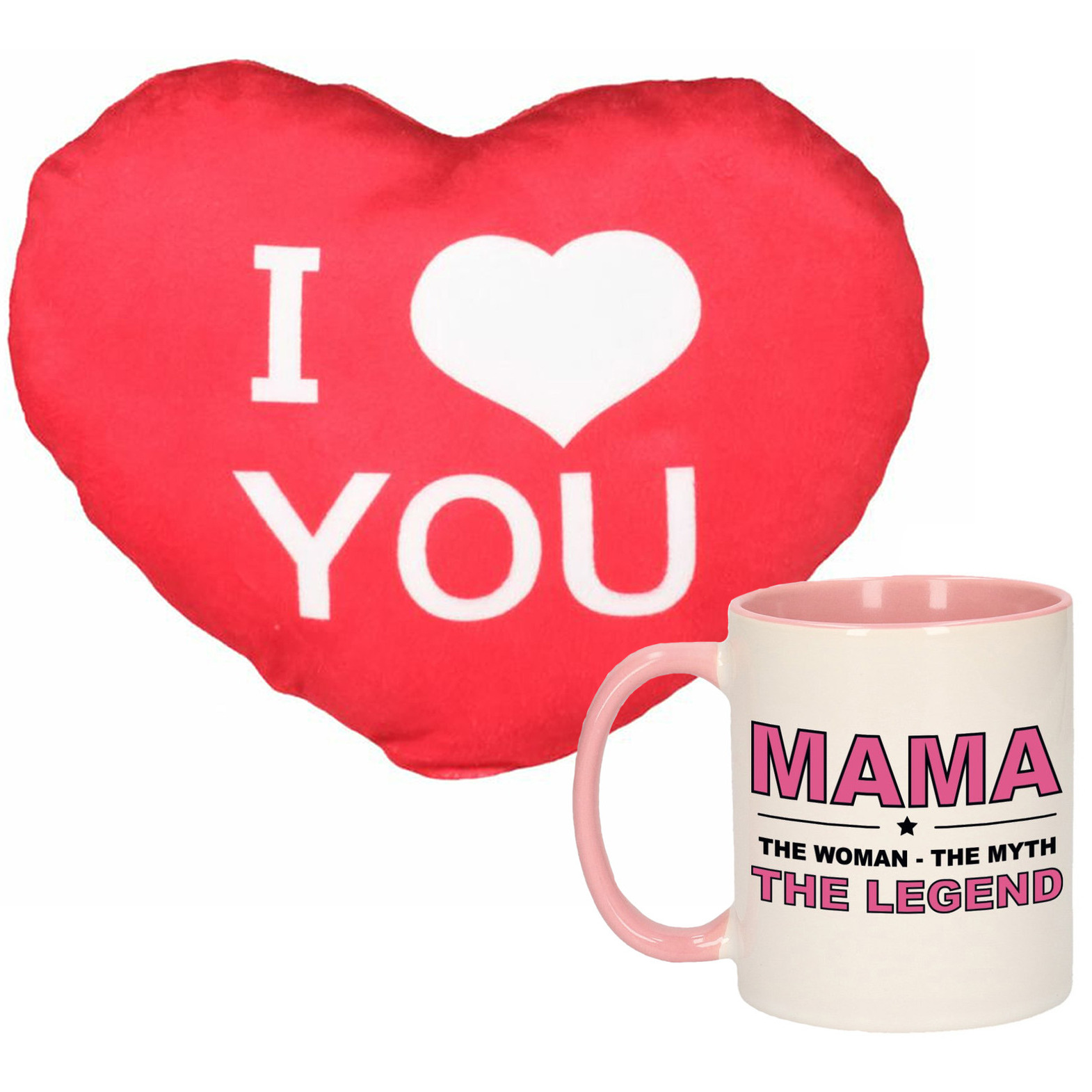, Dit artikel bestaat uit:, 1x Mama – the woman the myth the legend – Cadeau koffiemok – beker – wit en roze – moederdag, 1x Sierkussentje Valentijn/i Love You – hartjes vorm – rood – 15 cm
