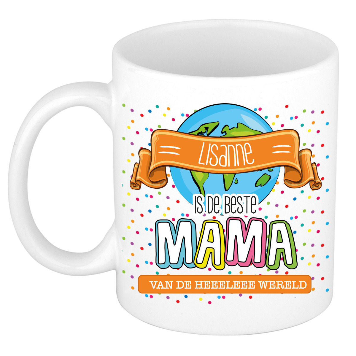 Verras mama Lisanne met een nieuwe mok. Is jouw moeder binnenkort jarig en heet je mams Lisanne? Geef dan deze leuke naam beker cadeau! Deze mok is bedrukt met de tekst: mama Lisanne, is de beste mama van de heeeleee wereld. Ook leuk om de geven tijdens Moederdag!
