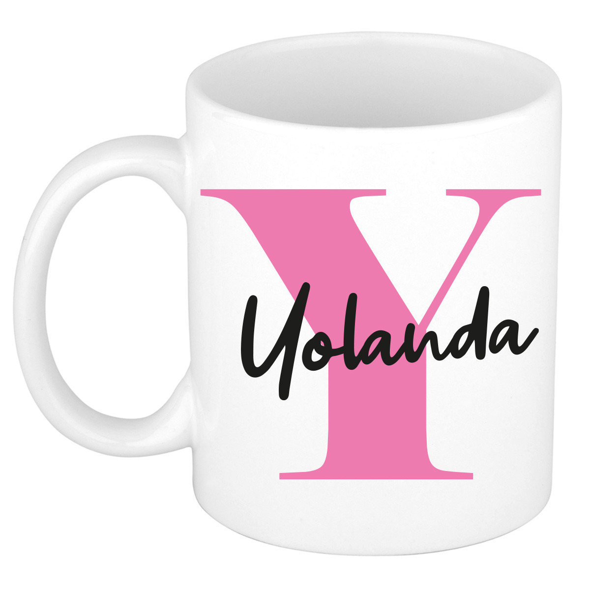 Verras Yolanda met haar nieuwe mok. Heb jij een collega of vriendin die Yolanda heet? Geef haar deze leuke naam beker cadeau! Deze mok is bedrukt met een roze eerste letter van de voornaam en de naam: Yolanda.
