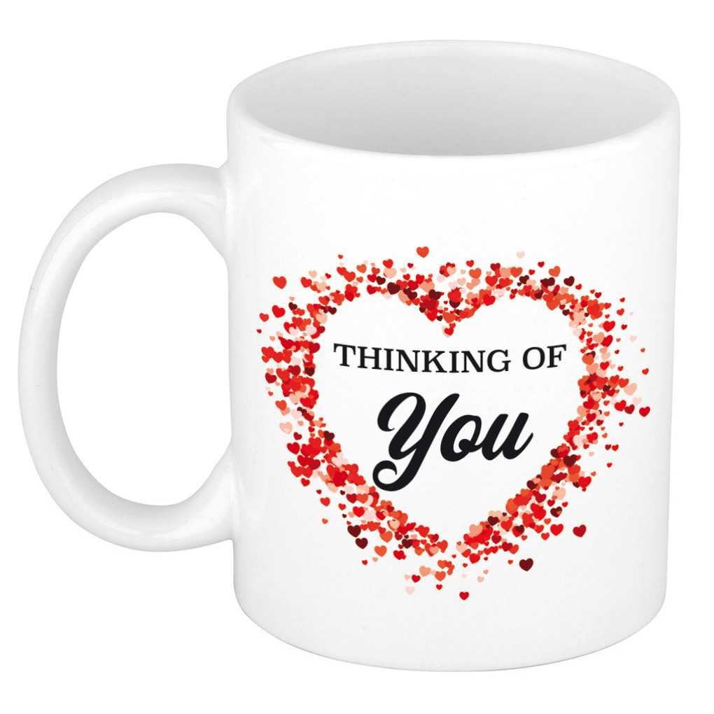 Thinking of you cadeau mok / beker wit, 300 ml. Deze mok/ beker is bedrukt met de tekst: Thinking of you. Met allemaal kleine hartjes in de vorm van een hart. Een leuke mok voor je geliefde, vriend / vriendin of iemand anders. Bijvoorbeeld als cadeau voor iemand zijn verjaardag of een ander gelegenheid. De beker is magnetronbestendig en vaatwasmachinebestendig en heeft een inhoud van c.a. 300 ml. materiaal: keramiek hoogte: 9,5 cm doorsnede: 8,2 cm