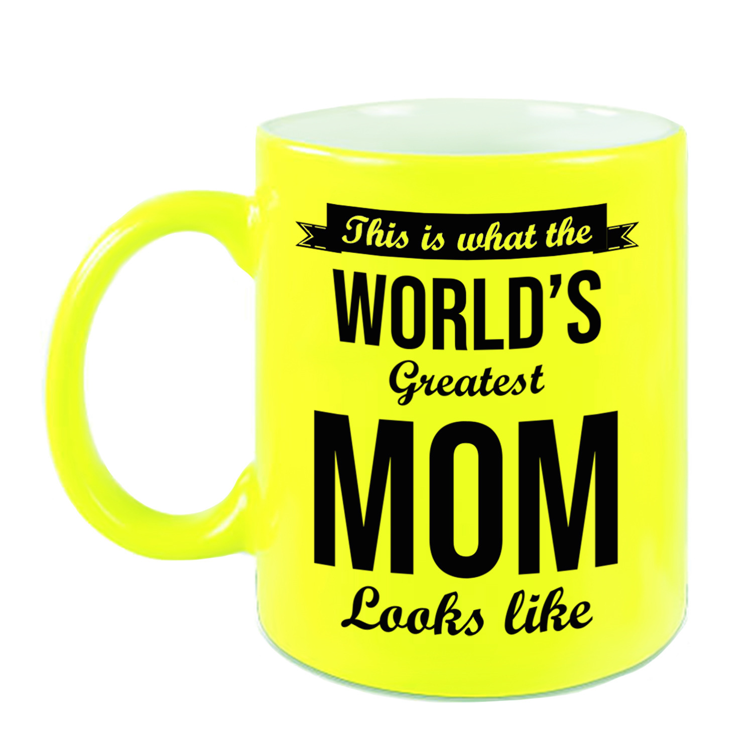 Leuke cadeau mok worlds greatest mom neon geel, 330 ml. Deze mok is bedrukt met de tekst: This is what the worlds greatest mom looks like. Leuk om cadeau te geven aan mama voor haar verjaardag, Moederdag of gewoon omdat zij het verdiend heeft! De mok heeft een inhoud van c.a. 330 ml. Om de bedrukking langer mooi te houden kunt u de beker het beste met de hand wassen en niet in de vaatwasser.