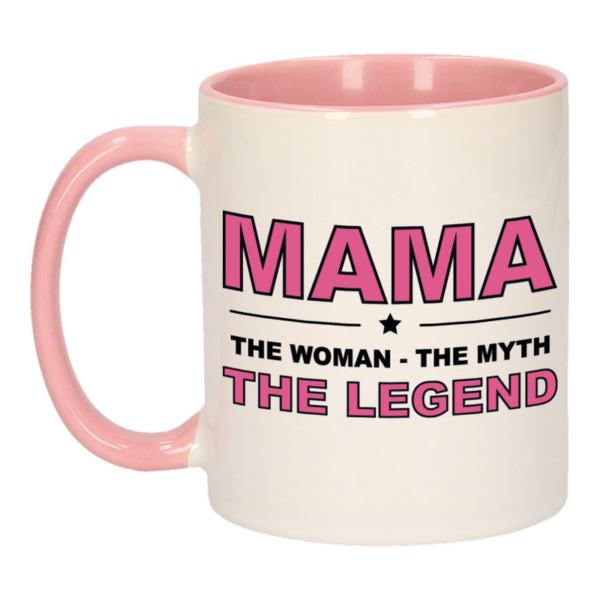 Mama – the woman the myth the legend – Cadeau koffiemok – beker – wit en roze – moederdag